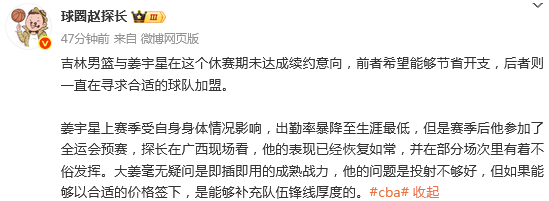 媒体人赵探长发文点评:吉林男篮与姜宇星在这个休赛期未达成续约意向,前者希望能够节省开支,后者则一直在寻求合适的球队加盟。